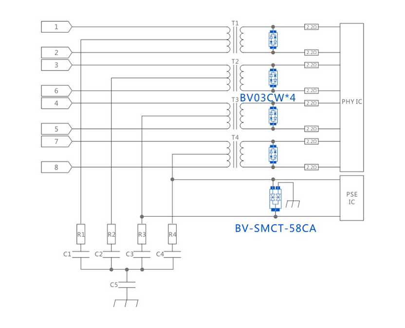 RJ45POE 10/700μs CM/DM 4KV-100A